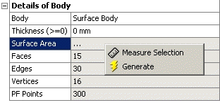 A setting in the Options dialog box defines a limit at which the DesignModeler application will stop automatically measuring a selection. This is intended to avoid doing CPU-intensive operations when the selection becomes complex. For properties that appear in the Details View, such as volumes and surface areas, you will see an ellipsis (...) instead of the calculated value when the object exceeds the automatic calculation limit defined in the Options dialog box.