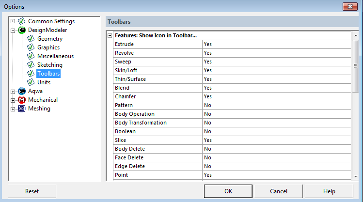 With the exception of Generate, Share Topology and Parameters, the Feature Toolbar is customizable via the Toolbars menu of the Options panel (shown above). The Toolbars menu is divided into two groups: