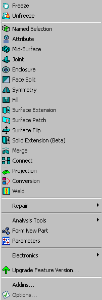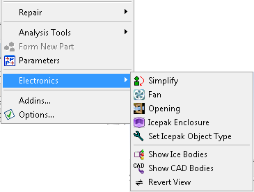 Note that the Electronics menu is shown in the Tools Menu only if the DesignModeler option Enable Electronics Options is set to Yes (default). The option is accessible via the Additional DesignModeler Options category in the Geometry section of the Options dialog box. Select No to deactivate the menu in the Tools menu.