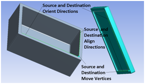 Select bodies, pair points for Source and Destination Move and directions for Source and Destination Align and Source and Destination Orient. Points can be Vertices, PF Points, or 2D Sketch Points. Upon clicking Generate, Ansys DesignModeler will transform selected bodies with Move points defining translation and Align, Orient defining rotation respectively. Typically, these points belong to source and destination bodies. You can choose not to specify Orient and Align. However, Align is necessary if Orient is specified.
