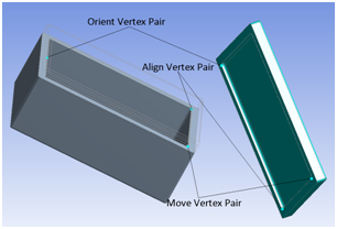 Select bodies and pairs of points for Move, Align and Orient. Points can be Vertices, PF Points, or 2D Sketch Points. Upon clicking Generate, Ansys DesignModeler will transform selected bodies with Move points defining translation and Align, Orient defining rotation respectively. Typically, these points belong to source and destination bodies. You can choose not to specify Orient and Align. However, input for Align property is necessary if Orient is specified.
