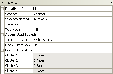 Faces within tolerances are grouped into Clusters of face sets. You can review each Cluster and delete a cluster if their respective face sets do not need to be connected. You can do this by selecting the cluster in the Details View in Modeling Mode, right-clicking, and choosing Delete in the context menu.