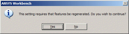 When the Saved Feature Data setting is increased from a lower level to a higher one, the Ansys DesignModeler application will check if internal feature data is present to satisfy the selected option. If insufficient feature data currently exists, it will prompt you to generate the model. Choosing Yes will generate the model to produce the required feature data. Choosing No will cancel the property change.