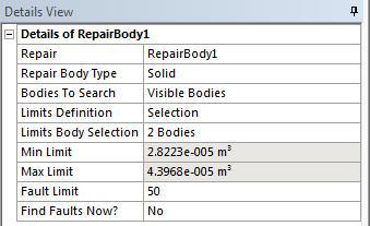 Based on Repair Body Type selected in the Details View, DesignModeler uses the respective body property as the criteria to search for small bodies in the model. Body properties for three body types are shown below.