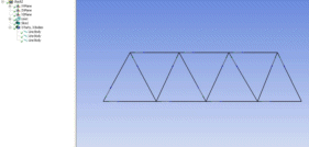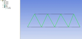 The first figure shows the body prior to the Slice Off Edges operation. It shows a truss having upper chords, lower chords, and cross chords all in a single body. Suppose that you desire to separate the cross-chords into a separate body so it can be assigned a different cross-section than the upper and lower chords. Select all cross chords as shown in the figure (selected edges are in green).
