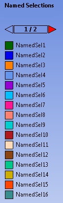 The Named Selection Legend allows for 20 unique colors for labeling sections. When more than 16 named selections exist, a set of arrows appears at the top of the legend to allow navigation between multiple pages. The inclusion of the individual Named Selection in this legend can be controlled by the Include in Legend property found in the Named Selections Details View.