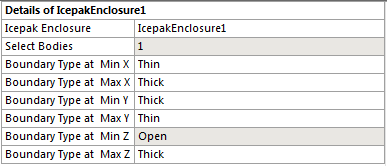 You need to pick enclosure-shaped solid bodies as input to the Icepak Enclosure feature. Once selected, hit Apply for the “Select Bodies” property; the boundary types for the different directions are detected based on the thickness and are updated automatically. If a face in a particular direction is open (has no thickness), then boundary type is shown as ‘Open’, otherwise ‘Thick’ will be shown and the thickness is usually measured as the center of the face. Afterwards, you can also change the boundary type to ‘Thin’.