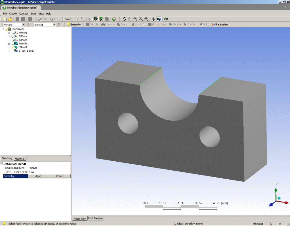 Specify the blend radius as desired, and start edge selection by double-clicking the Geometry property, thus bringing up the Apply/Cancel buttons, and perform your edge selection: