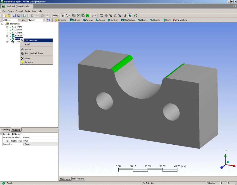 Click Apply, to accept your selection, and then Generate to create the Blend feature. Now, assume more modeling has been done, and after some other features have been created, you want to go back and edit the above edge selection. Use the right mouse button Context Menus over the Blend feature…