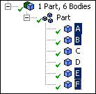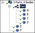 You have all six bodies in a single part. You wish to move bodies A, B, E, and F into their own separate part.