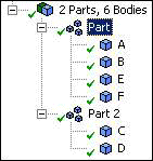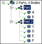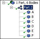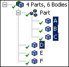 You have bodies A and B in a part, while bodies C, D, E, and F are in Part 2. You wish to combine all six bodies into a single part.