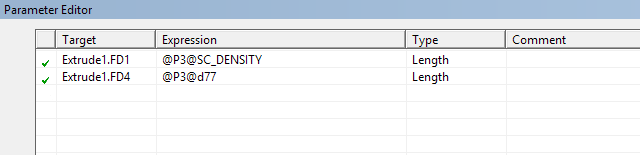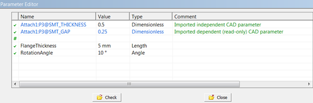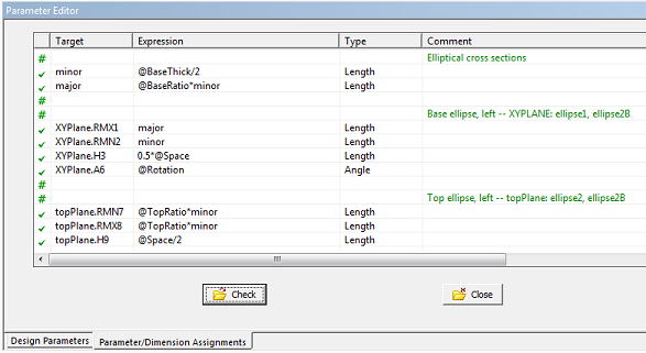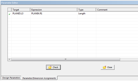 The Check button triggers an execution of the Parameter/Dimension Assignments without updating the model. This can serve as a "syntax check" in case you are using nontrivial assignments. In some cases you may need to click Check twice because of multiple nested dependencies. You may also need to Generate the model more than once due to interactions between Sketch Dimensions and the model. This is especially true when planes are created from faces and dimensions or constraints depend on face boundaries. If errors are detected during a Check operation, Design Parameter and/or Parameter/Dimension Assignment rows will be marked with the error status; an error message can be read by right clicking the top of the treeview.