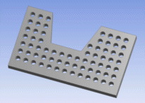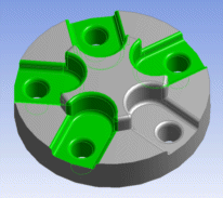 For face selections, each connected face set is patterned independently of other face sets. For a face pattern to succeed, the copied instance of the face set must remain coincident with the body it originated from, or be able to be easily extended to it. The new faces of the pattern must touch the topological entities that were incident to the original face set, also known as the base region. Additionally, the instances for face sets may not intersect each other or the original face set. The faces may belong to either active or frozen bodies. An example of the base region is shown below.