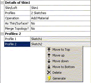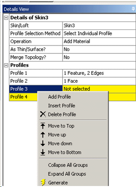 Profiles are reordered through the Details View. The Skin/Loft feature's Details View will list the selected profiles in order. If you select a profile and then click the right mouse button, a context menu Context Menus appears which allows you to reorder that profile's position in the list, as illustrated below.