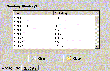 By default, the slot angles are equally spaced in a full circle, with the spacing based on dividing 360 by the number of slots. Anytime you change the number of slots, this spacing is adjusted based on the above formula, and any custom angles you have entered are lost. If you want to change the angles, then when the Winding Table is being displayed via View Winding Table, you can click on the Slot Data tab to view the slot angles.