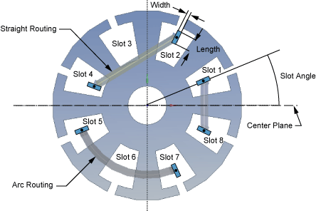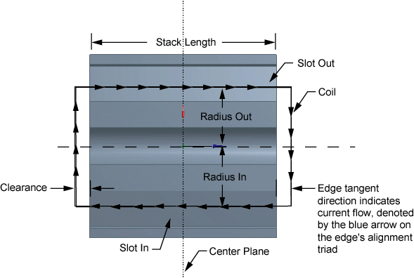 Before selecting Winding Table from the Tools Menu , you should first create a model of the rotor or stator to which it will be applied, and the center plane that will define the alignment of the Winding Bodies. Below are two diagrams showing how the winding coils are defined.