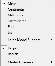 The Units Menu can be used to change the current length unit of the session. The menu consists of two types of units; namely length-based units and angle-based units. Length-based units are broadly classified based on model size into three types: Small, Medium, and Large.