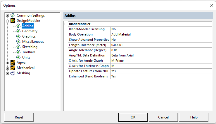 BladeModeler Licensing: This preference lets you control whether a BladeModeler license is checked out upon DesignModeler start-up, thereby enabling the BladeModeler addin. The choices are: