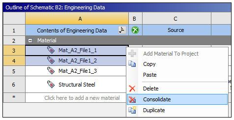 Merges all identical selected materials into a single material. Appears in the context menu when you select multiple materials and at least two of the selected materials contain the same data and come from the same source.