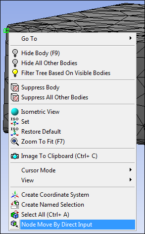 Note: If you update your mesh (Mesh object>), the application maintains your movements in the Worksheet until the mesh is cleared (zero nodes) using the RMB option or you refresh data from the CAD source.