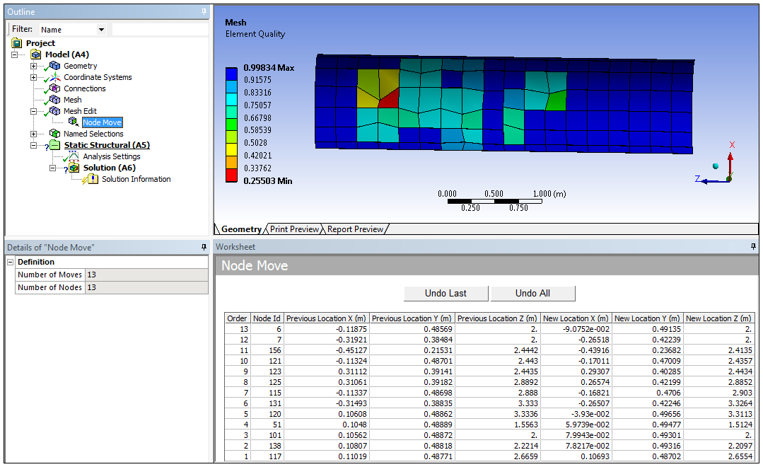 Moving a node on a solved analysis causes the solution data to become obsolete. However, the state does not become obsolete for other objects that depend on the mesh (for example, imported loading conditions, Element Orientations). If your node movement changes affect other objects, you will need to manually clear and refresh these objects to apply the new changes.