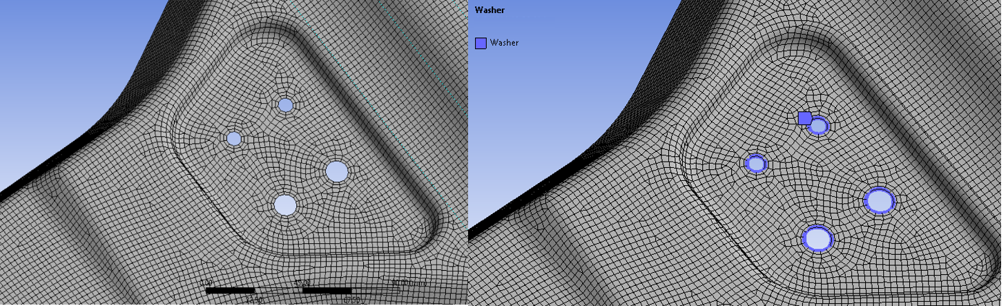 When the edge sizes on the hole boundary are smaller than the allowed minimum size, you should use a smaller value for the Minimum Number of Divisions to get a good quality mesh for the washer layers.