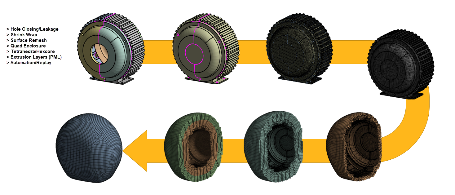 External FEM Acoustics workflow creates external acoustic sound radiation domain to predict the propagation of radiated sound in the near field and far field due to vibration of the external surface of the structural assembly or flow source port of the fluid flow.