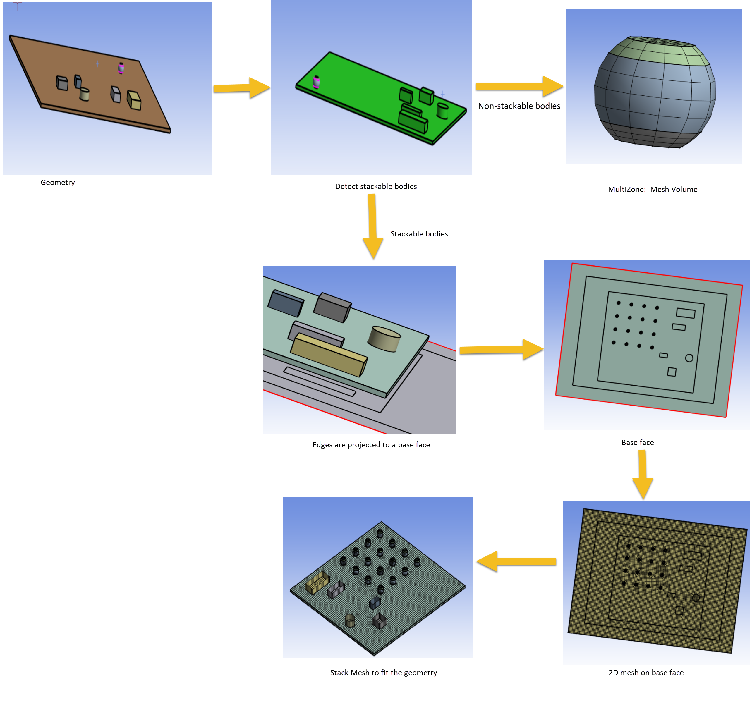 Stacker Mesh Workflow maps a 3D model to a 2D plane and generates a 2D mesh to stack it to represent the original input model. The workflow contains steps to detect the stackable bodies, non-stackable bodies and create a MultiZone volume mesh for non-stackable bodies.