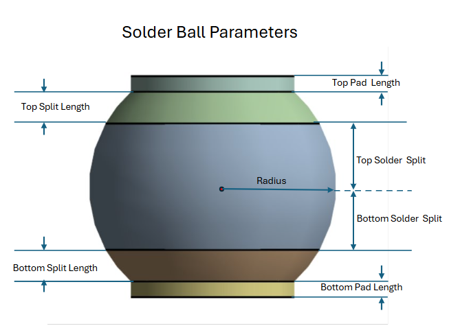 parameterize the Top Split Length.Bottom Split Length: Allows you to specify the length of the bottom split from the origin of the bottom split. Bottom Split Length is available only when Solder Ball Shape is Sphere. The default value is 0.125 mm. You can click