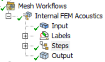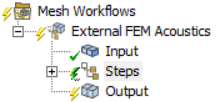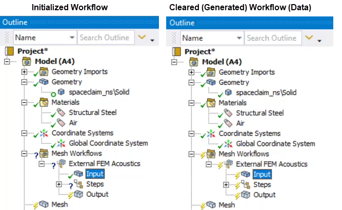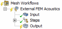 When your mesh workflow is initialized, the Input object is preceded by a check mark to indicate the input geometry is fully transferred. Additionally, when your workflow steps are fully executed, the Steps object is preceded by a check mark to indicate that the workflow generated data is ready for output: