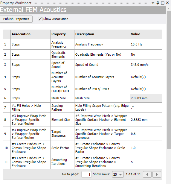 Property Worksheet allows you to view the published properties of each control involved in mesh workflows, the Settings defined in the Steps Details view, and to edit individual controls. Also, displays the default published properties for the respective Mesh Workflow. Property Worksheet provides an easy visualization of the input options for mesh workflows and to edit individual controls.