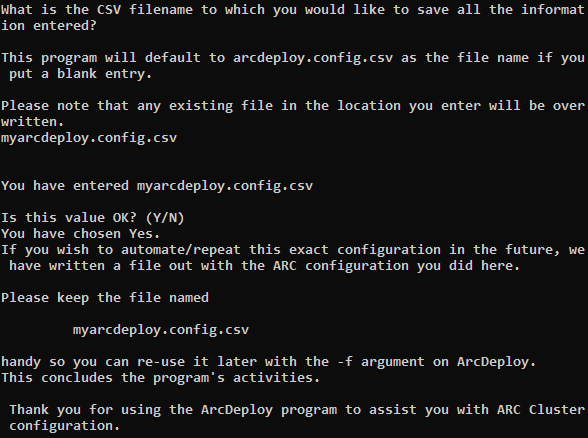To save all of the information that you have entered to the default CSV file name, arcdeploy.config.csv, simply press Enter. Otherwise, type the desired file name and press Enter.
