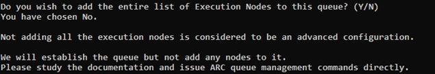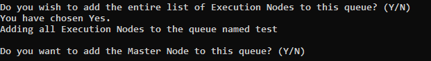 All Execution nodes are added to the queue. When prompted, specify whether or not you want to add the Master node to the queue as well, by typing either y or n: