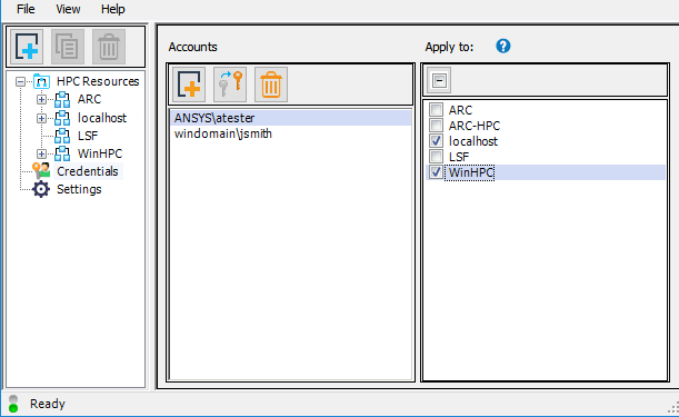 Since RSM requests, validates and caches your credentials when you first submit a job to RSM, it is generally unnecessary to manually create user accounts in RSM. If you would prefer to cache your password in advance of submitting jobs to RSM (for example, if you want to run a Workbench job in batch mode), you can add an account in RSM that contains the credentials necessary to access the HPC resource, and apply the account to the RSM configuration that is associated with that HPC resource.