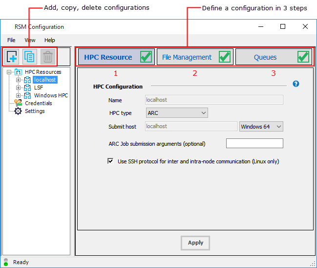 The RSM Configuration application provides a friendly, wizard-like interface that enables you to define RSM configurations quickly and easily. Defining a configuration involves a 3-part series of steps.