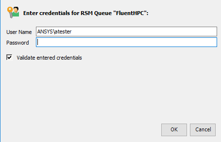 If you submit a job to RSM from Workbench, and credentials have not yet been cached for the RSM queue in RSM, or the cached password does not validate because your OS password has changed or expired, you will be prompted to specify credentials for that queue: