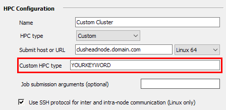 Custom” is not used as the keyword. Rather, the value that you specify in the Custom HPC type field in the RSM configuration will become your “keyword”, and you can customize job execution on the cluster by adding a section for your new keyword in the jobConfiguration.xml file. The section will list the files that you want to apply to the custom job type.