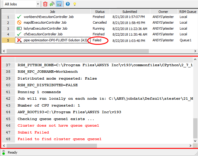 To display a log for a particular job, simply click the job in the upper pane. Details about the job are displayed in the lower pane: