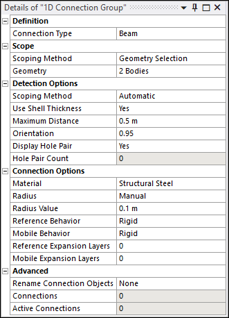 To create connection objects, you need a reference/mobile or contact/target pair. The following properties facilitate their detection, and the pairs are then scoped to the connection objects as reference/mobile (for Beam, Spring and Joint) or contact/target (for Contact) entities.