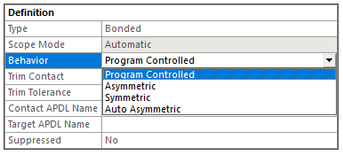 Auto Asymmetric automatically creates an asymmetric contact pair, when possible, which can boost performance. With this setting, the solver selects the best contact face during the solution phase. [In Explicit Dynamics analyses this option is available for Bonded connections; see Bonded Type.]