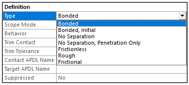 The contact type specifies how the contact and target surfaces (contact pair) separate or slide relative to each other. Available contact types are listed in the following figure and described briefly here. For further details, see the Contact Region object reference description: Definition.