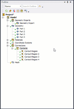 : Enables you to change the contact region name to include the corresponding names of the items in the Geometry branch of the tree that make up the contact region. The items are separated by the word "To" in the new contact region name. You can change all the contact region names at once by clicking the right mouse button on the Connections branch, then choosing from that context menu. A demonstration of this feature follows.