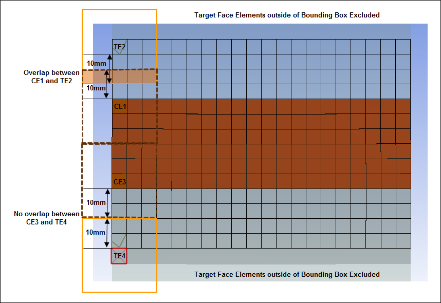 The brown area illustrated below represents the elements from the contact face. On the corresponding target side exist potential elements from the entire target face. The elements of the target face that will be kept are drawn in black. On the target Face, each element bounding box is expanded by 10mm and an overlap is sought against each element from the contact side. Referring to the image below, the bounding boxes between Contact Element 1 (CE1) and Target Element 2 (TE2) overlap and therefore TE2 is included in the analysis. Meanwhile, CE3 and TE4 do not overlap and as a result, TE4 is not included in the analysis. This results in a reduced number of elements in the analysis and, typically, a faster solution.