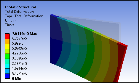 Displays the result with a translucent overlay of the undeformed model, as illustrated below. By default, this undeformed display is only supported for the Exterior option in the Geometry menu. The , , and options display the result with the translucent overlay of the model in a deformed state, as illustrated. Option - Translucent Overlay Not Deformed