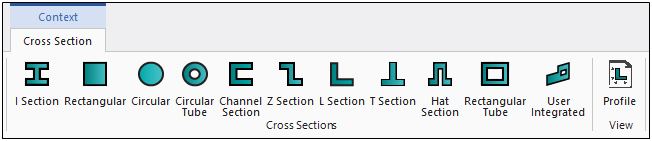 The Cross Section Context tab provides cross section type options that enable you to manually define a cross section for your line body model. There is also a Profile option that displays a window that enables you to view the cross section dimensions, during construction as well as when you are complete.