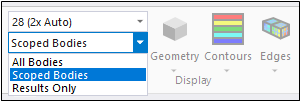 For the Scoped Bodies option for results that are scoped across multiple entities (vertices, edges, faces, or volumes), all of these entities may not display because there are times when only the nodes of one of the shared entities are used in the calculation.