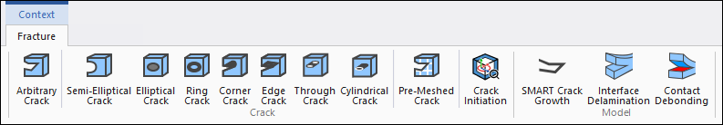 The Fracture Context tab enables you to insert the objects associated with a Fracture Analysis, including different Crack types, Crack Initiation, SMART Crack Growth, as well as progressive failure features in the form of Interface Delamination and Contact Debonding objects.