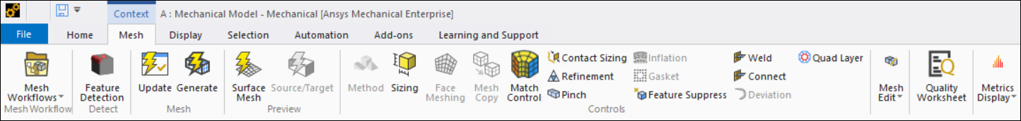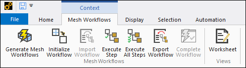 | Mesh Workflows | Inserts a Mesh Workflows object. Also, see the Mesh Workflows Context topic below. |