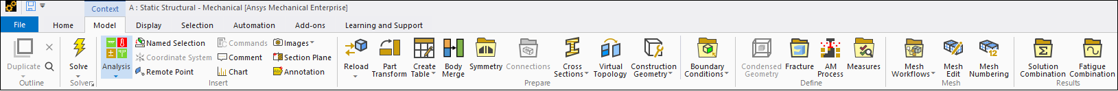 | Symmetry | Based on your analysis type, the Symmetry Context tab includes options to insert symmetry analysis objects. |