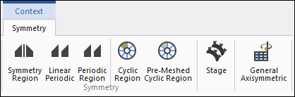 Based on your analysis type, the Symmetry context tab includes options to insert a Symmetry Region (including Linear Periodic), Periodic Region, Cyclic Region, Pre-Meshed Cyclic Region, Stage, and General Axisymmetric objects. See the Symmetry section for more information.